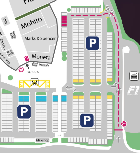 Směnárna, bankomaty, kadeřnictví, cestovní agentura, prádlomat, automyčka, trafika a koutek pro děti.