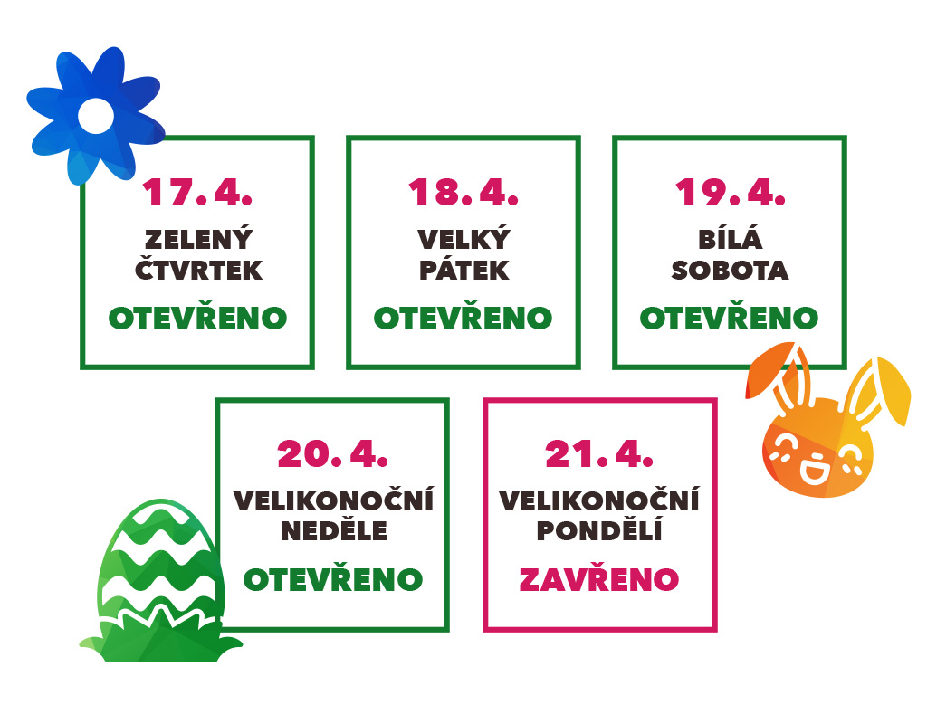 Na Velký pátek 18. dubna bude bude otevřeno bez omezení a volného dne tak můžete využít k nákupům nebo obědu v naší gastro zóně. Na Velikonoční pondělí 21. dubna bude naopak zavřeno. Užít si tak budete moci v klidu s rodinou velikonoční koledu.